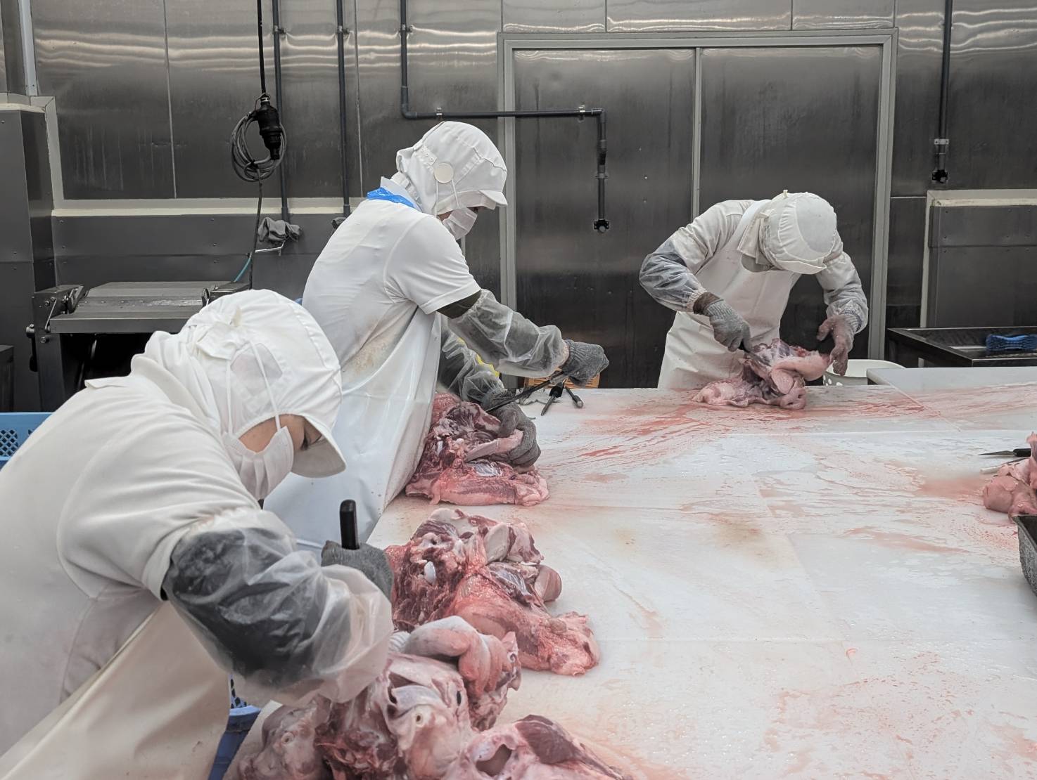 屠体から頭を切り離し検査台へ落とし、腹部を切開し直腸を引き外し内臓を取りやすいよう作業します。
